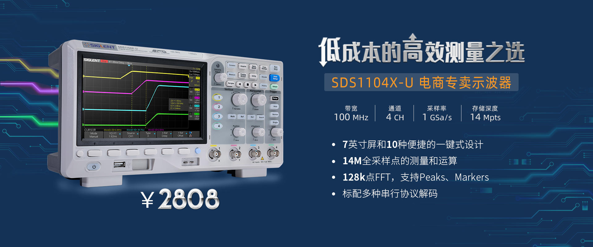 作為入門級數(shù)字示波器,SDS1104X-U帶寬100 MHz,采樣率1 GSa/s,能滿足工程師大部分的信號測量需求。10種便捷化一鍵操作,38種自動(dòng)測量功能,...